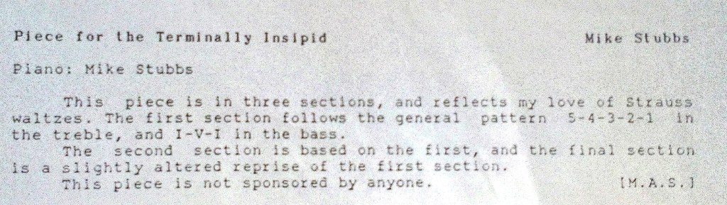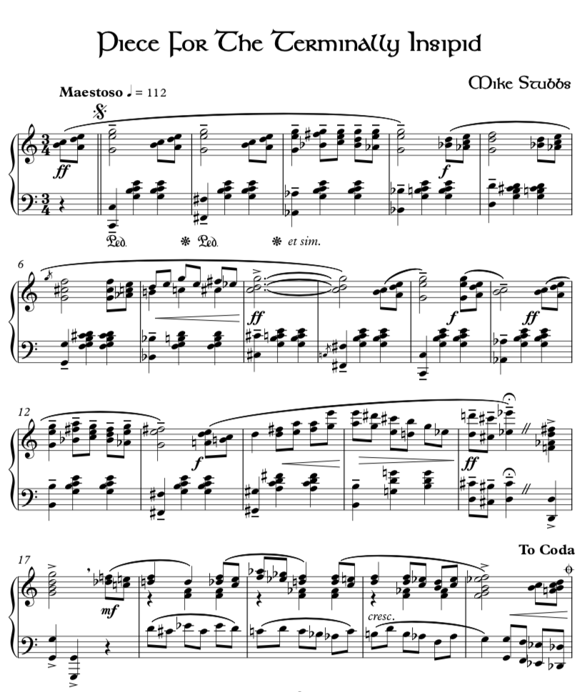 Subtlety goes out of the window in a frivilous piece designed to amuse both performer and listener alike. Originally written as coursework about (in the composer’s view) a particularly soul-less form of musical analysis, it brought the house down at its first performance.