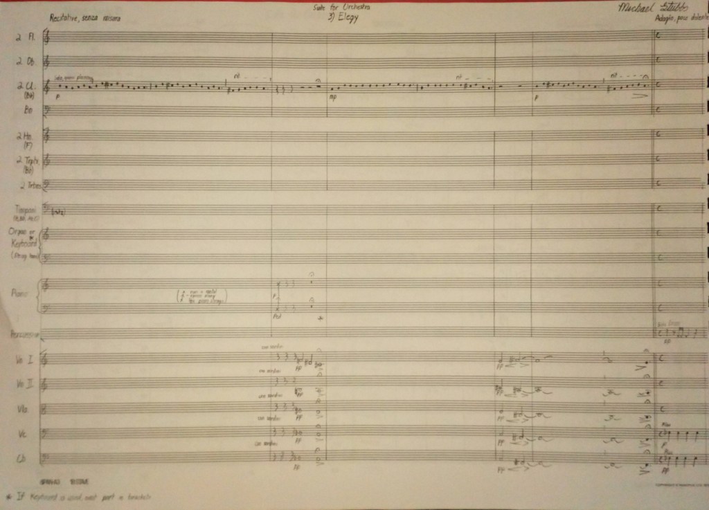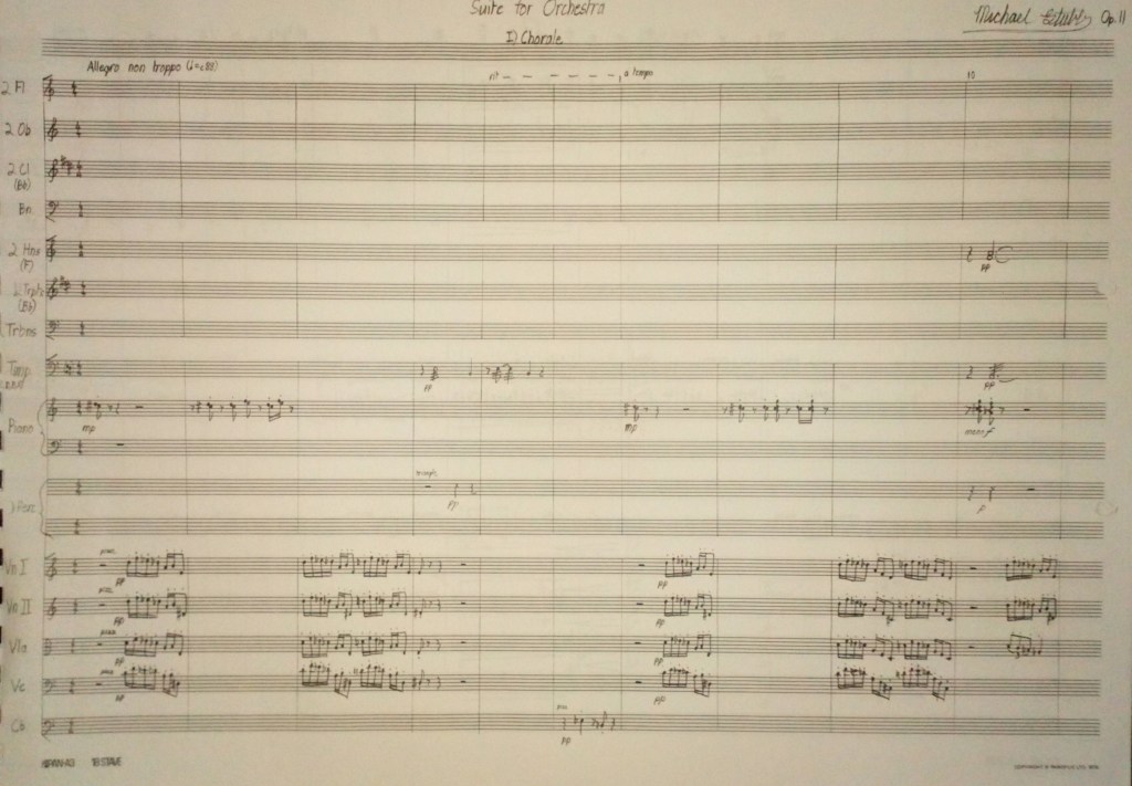 After a few weeks and much deliberation, I made up my mind to re-work the piece for small orchestra (strings and woodwind) and to add a couple of contrasting pieces, an Elegy and a dance perhaps, to compliment it. Then, later, after much thought, I decided to add an opening piece and hence the ‘Suite for Orchestra’ was born.